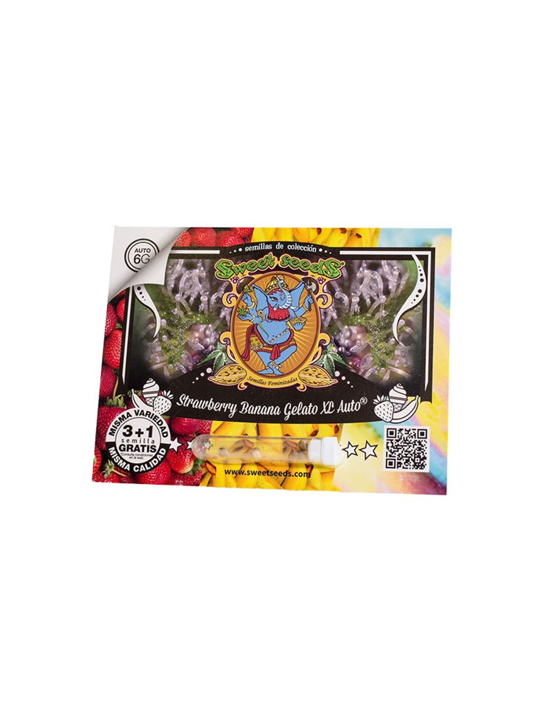 Autofloreciente de 6ª Generación, resultado del cruce entre un clon élite de Strawberry Banana (Crockett's Banana Kush x Bubblegum) y nuestra Sweet Gelato Auto® (SWS76). Esta variedad destaca por su aroma dulce y afrutado, con notas de chicle de fresa y toques OG Kush, además de pinceladas de maderas y rúcula. De rápida floración, alta resinosa y productiva, produce cogollos densos cubiertos de tricomas grandes, con un contenido elevado de THC.
