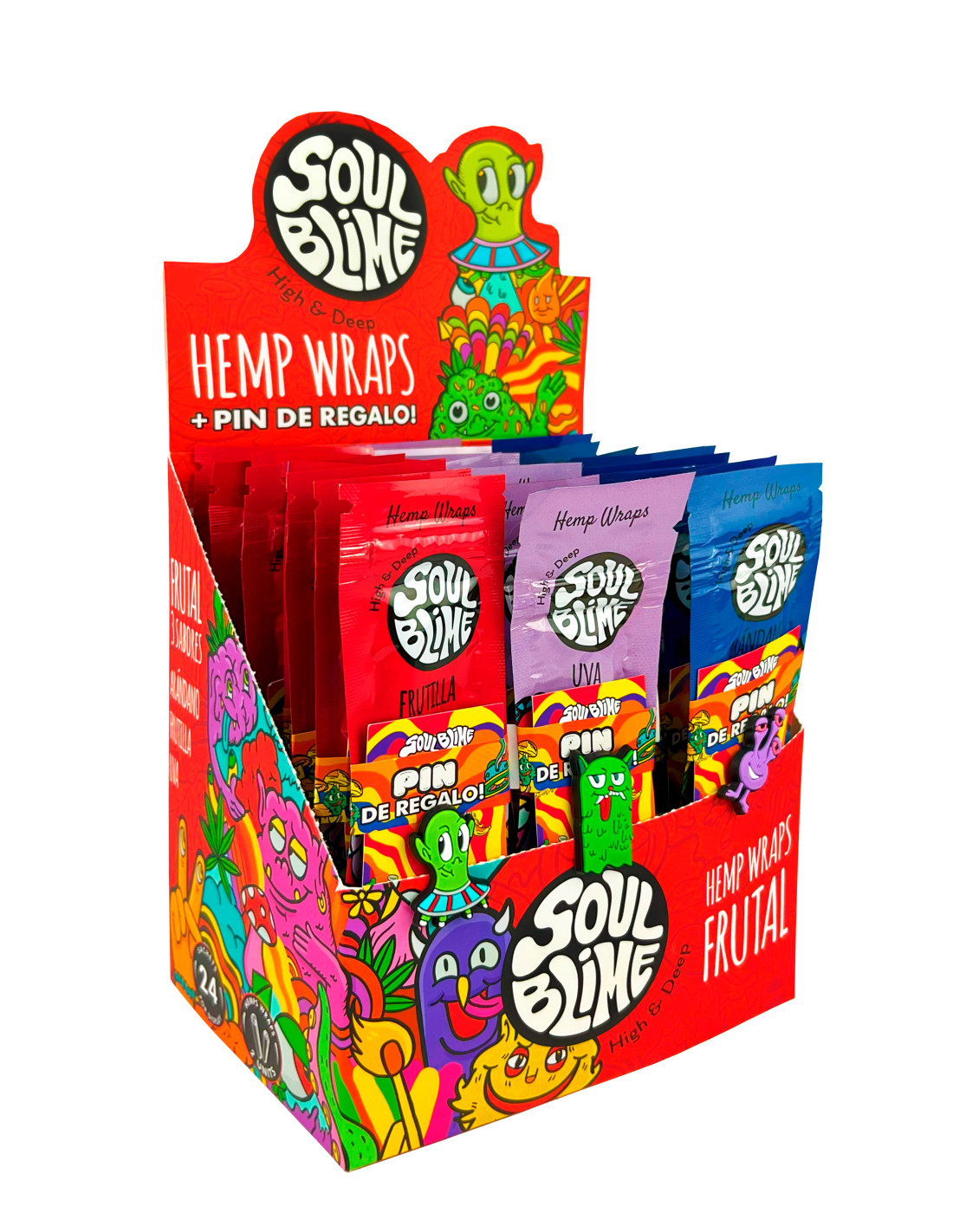 Display de 24 unidades de Hemp Wraps Soulblime Frutal. Cada sobre contiene 2 hojas de hemp wraps + pin de regalo. Vienen 3 sabores: uva, arandano y frutilla, con 8 unidades de cada sabor.
