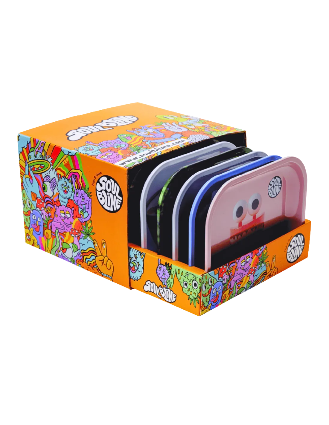Display de 8 unidades de bandejas Soulblime. Bandejas metalicas de 18 x 14cm con motivos surtidos.