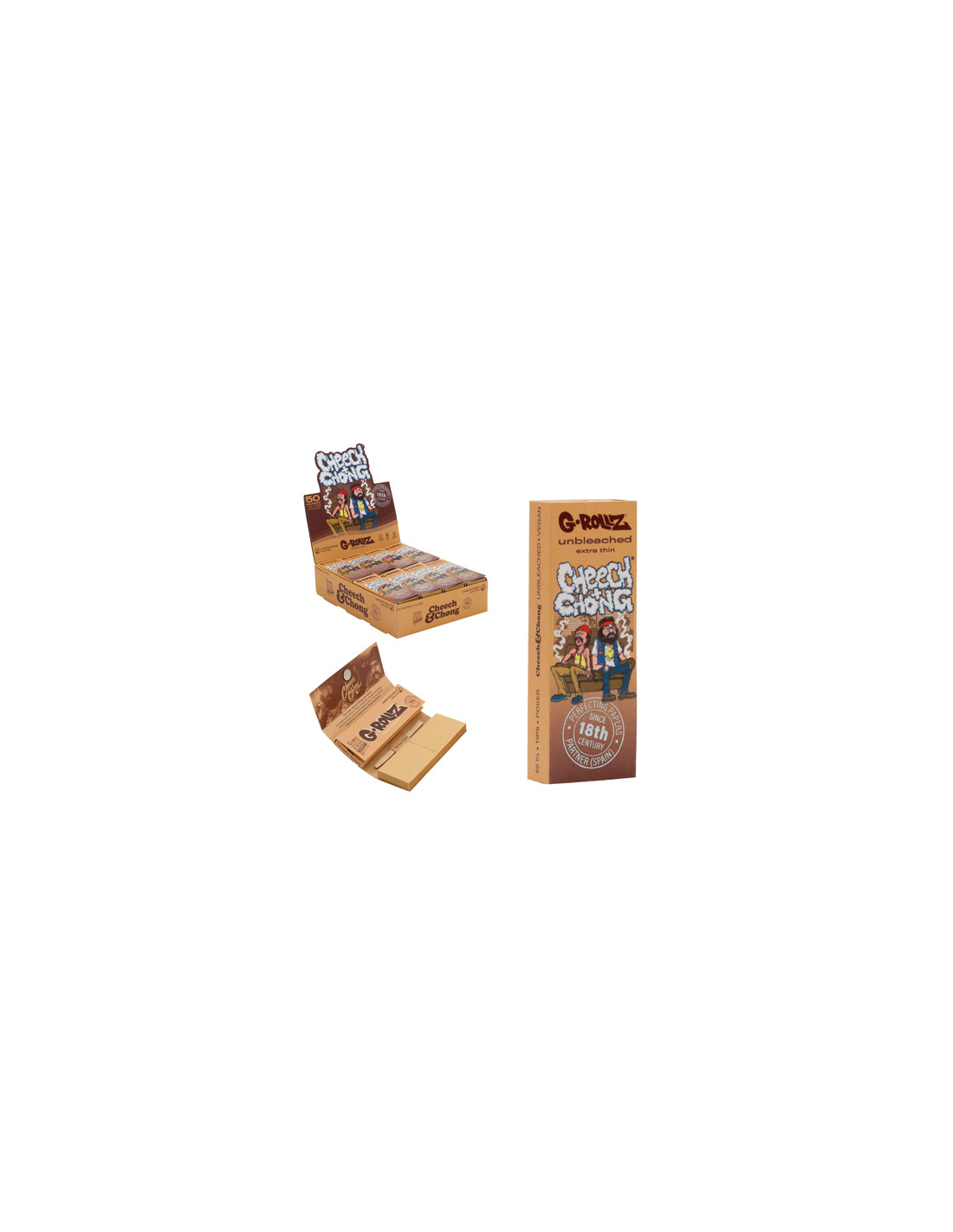 Papelillos G-Rollz 1 1/4 + Tips Unbleached Cheech & Chong In da Chair, ideales para quienes buscan un formato completo y práctico. Cada display incluye 24 libritos, con 4 diseños distintos.