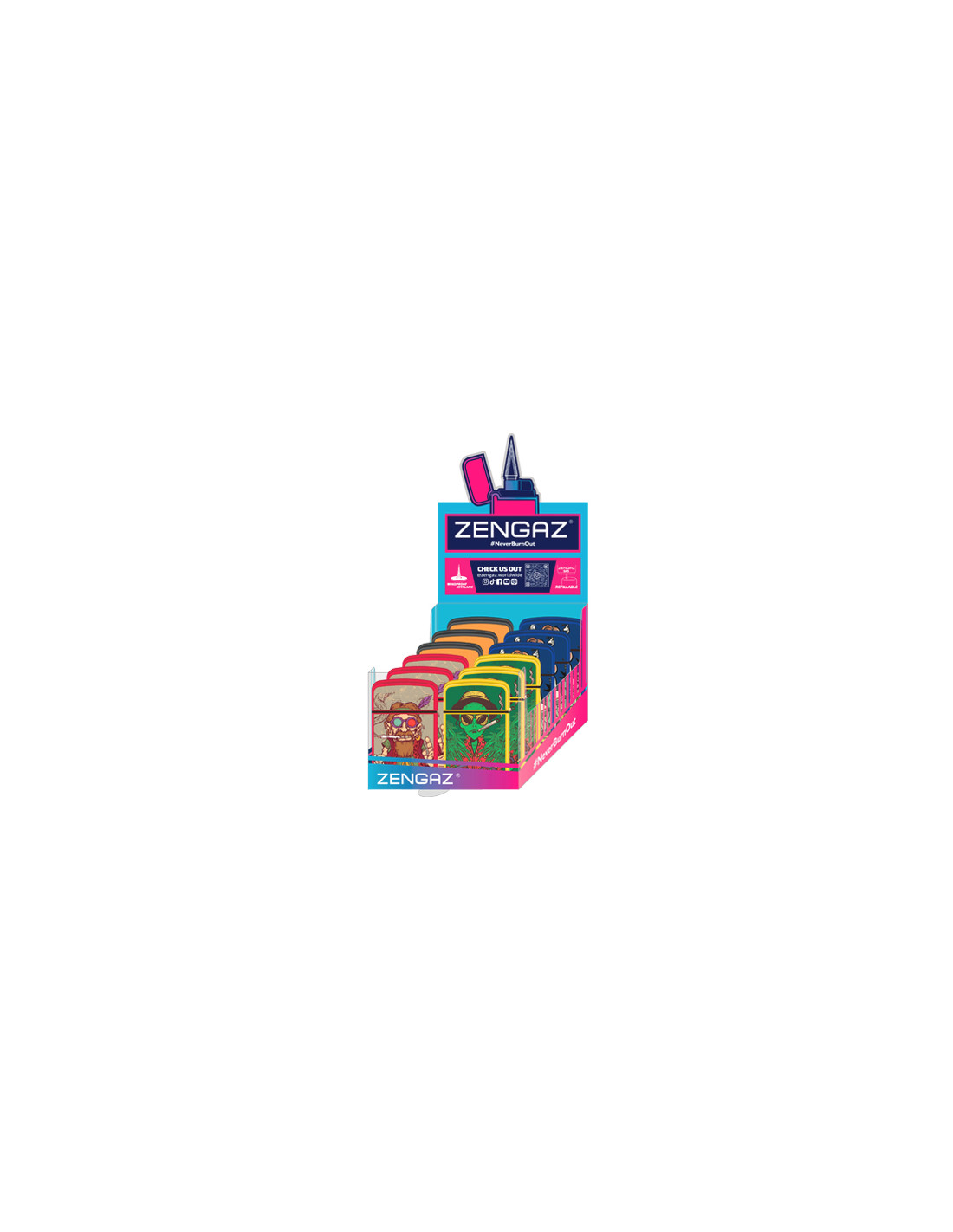 Display de 12 unidades de encendedores Zengaz. Modelo ZL12 SMOKE 2. Son 4 motivos diferentes de encendedores recargables con llama regulable y llama tipo soplete (jet flame) a prueba de viento. Encendedores de calidad premium, certificado en Chile y con certificación ISO 9994.