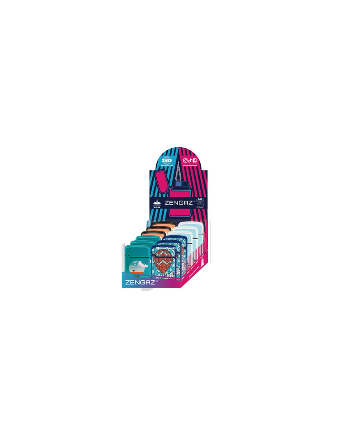 Display de 12 unidades de encendedores Zengaz. Modelo ZL12 ROAD TRIP. Son 4 motivos diferentes de encendedores recargables con llama regulable y llama tipo soplete (jet flame) a prueba de viento.